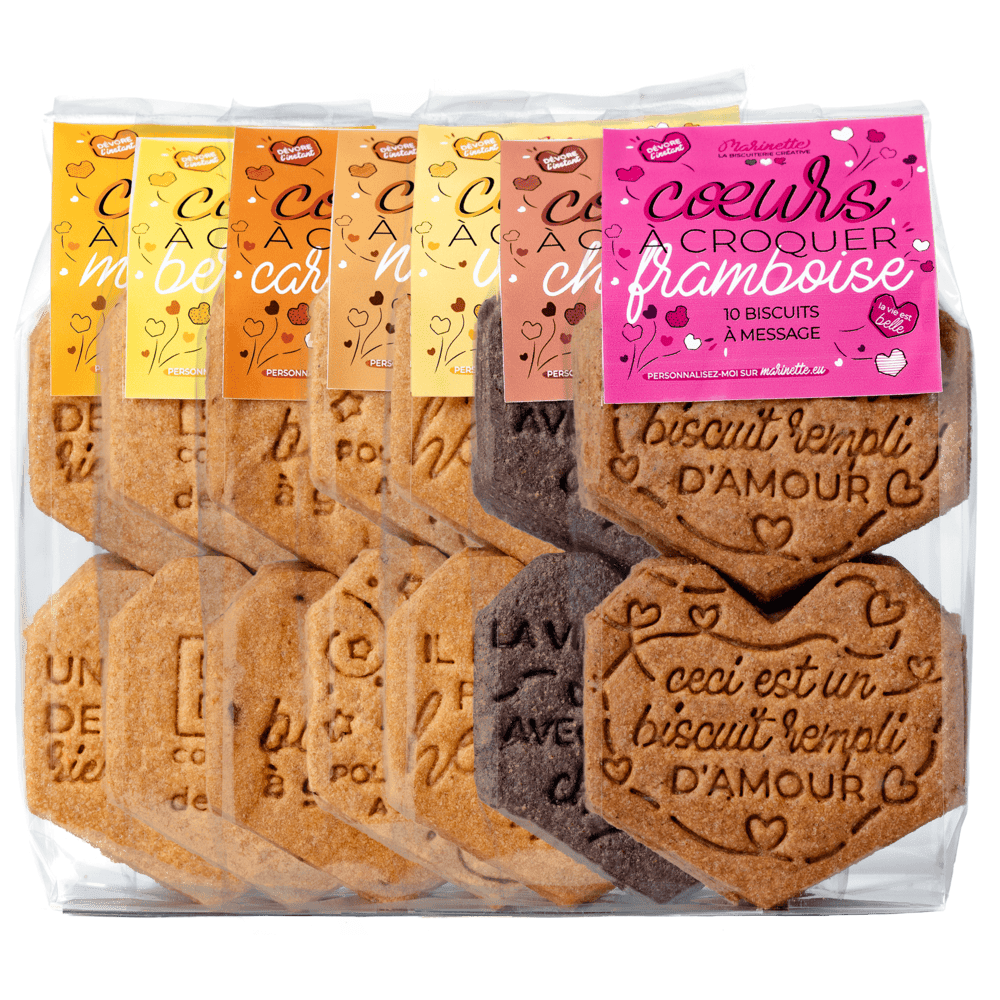 Ces jolis cœurs à croquer sont l'œuvre d'un travail artisanal passionné. Nos délicieuses recettes sont bien beurrées, peu sucrées, à la composition très courte et dépourvue de conservateur, avec une signature gustative d'exception : la fleur de sel. Croquez que de bons ingrédients, issus essentiellement de nos producteurs favoris du Grand Est, sélectionnés en circuit-court. Cerise sur le gâteau, nos emballages sont écoresponsables : biodégradables ou recyclables, c'est une gourmandise sans culpabilité !